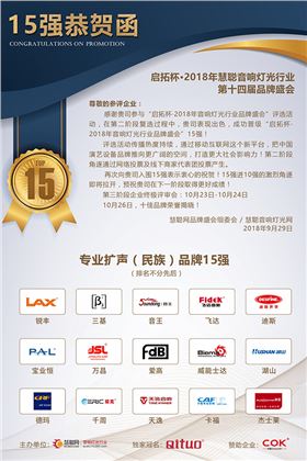 2018年音響燈光行業(yè)品牌評選第二階段經(jīng)過半個(gè)月的激烈角逐,通過線上+線下實(shí)名投票,在9月28號下午17::00正式誕生15強(qiáng)品牌,爵士龍音響以排名最好的成績再一次晉級。將迎來十大品牌的最后挑戰(zhàn)。