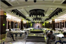 爵士龍工程師根據宴會廳堂的面積大小、功能的需求選擇LAB608線陣音響系統進行擴聲。此外,根據宴會廳的功能需求適當增加了數字音頻處理器、均衡器、效果器、話筒等周邊設備,為婚禮現場帶來震撼音效。