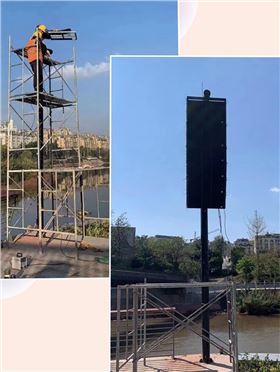 確定選用設(shè)備后,工程人員便投入到嚴(yán)謹(jǐn)?shù)陌惭b工作中去,所采用的LA線陣列吊掛系統(tǒng)具有非常人性化的設(shè)計(jì),簡(jiǎn)易靈活,大大節(jié)省了人手和安裝的時(shí)間;設(shè)備安裝后經(jīng)過(guò)首次測(cè)試,對(duì)不滿意部分繼續(xù)調(diào)整后,得到了多方滿意的效果,最終獲得甲方的認(rèn)可和稱贊。