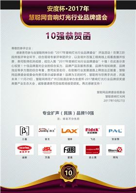 2017年慧聰網音響燈光行業品牌評選活動十強結果于10月27日正式揭曉。經過長達3個月的全方位考核,從海選30強——競爭15強——終極10強,爵士龍音響品牌再次獲得十佳擴聲系統品牌榮譽!