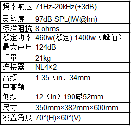 緊湊型兩路分頻系列,多用途箱體設計,寬廣的覆蓋角度,1.35VC壓縮驅動高音,多懸掛點容易吊裝,可調整水平與垂直覆蓋角度,12寸低失真高效率中低紙盆單元。