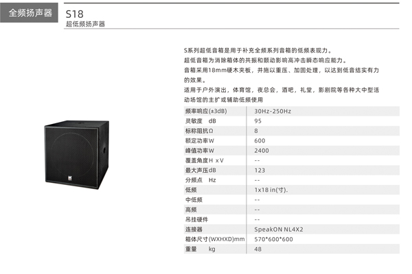 第二,配什么類型(或規格的)超低音音箱。由于超低音音箱有12”、15”,有18”或24”等不同規格。那又該如何選呢?這要看我們整個應用是強調低音的力度還是低音下潛的深度。比如在迪吧,我們就應強調低音的力度,如是影院,我們就應該強調低音下潛的深度,還有我們要注意整個音頻范圍內低頻段的衍接以及聲壓級的需要。比如我們全頻音箱選的是12”低音單元,一般超低音箱子應選擇15”低音單元,如全頻音箱選的是18”低音單元,一般超低音箱子應選18”或24”的低音單元,不能是全頻箱子是12”超低音選18”。