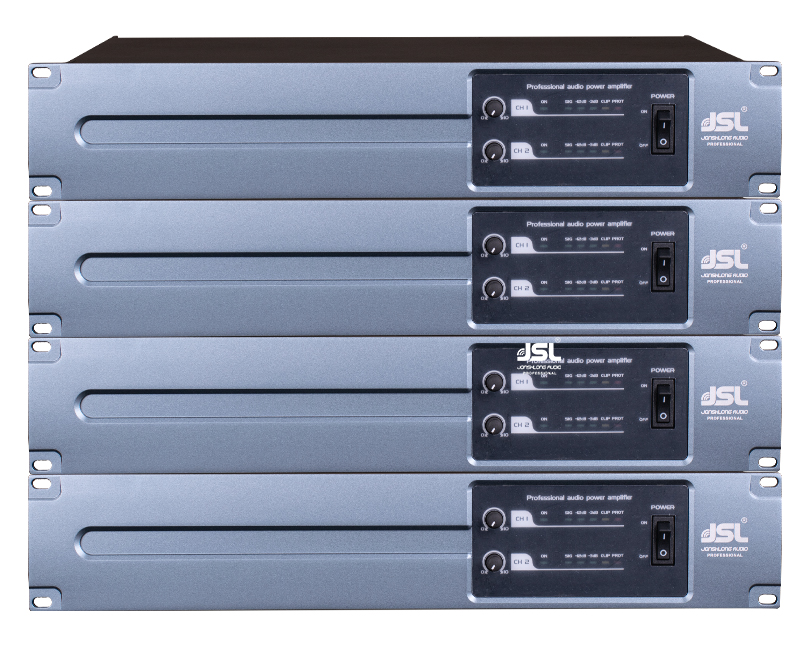| DE-2300 | 雙通道功率放大器 1.額定功率:2×2Ω:560W(@ 1 kHz<1% T.H.D.兩通道驅(qū)動), 2×4Ω:375W(@ 1 kHz<1% T.H.D.兩通道驅(qū)動), 2×8Ω:250W(@ 1 kHz<1% T.H.D.兩通道驅(qū)動); 2.橋接:1×4Ω:1120W (@ 1 kHz<1% T.H.D.), 1×8Ω:750W (@ 1 kHz<1% T.H.D.), 1×16Ω:500W (@ 1 kHz<1% T.H.D.); 3.頻率響應(yīng): 20Hz - 20 kHz; 4.THD+N:<0.05%; 5.阻尼系數(shù):>1000; 6.輸入靈敏度: 0.775V、1.0V、32dB; 7.信噪比:> -102dB; 8.LED顯示,信號指示,狀態(tài)指示燈、限幅指示; 9.保護(hù):電源欠壓保護(hù)、功放輸出直流保護(hù)、過熱保護(hù)、溫度功率控制、過載功率控制; |