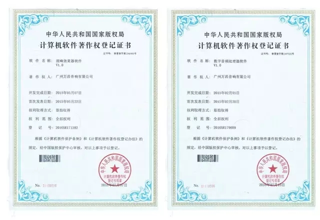 除了產(chǎn)品研發(fā)取得科研成果外,萬昌企業(yè)在計算機(jī)軟件方面也取得突破性的發(fā)展,分別獲得“混響效果器V1.0”和“數(shù)字音頻處理器V1.0”著作權(quán)證書。這對組建音響系統(tǒng)有實質(zhì)性作用,能讓音響系統(tǒng)發(fā)揮更加出色的音質(zhì)效果。