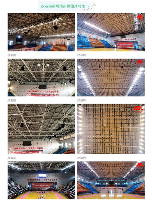 此次爵士龍對焦作一中體育館擴聲系統的改造升級,不單運用擴聲專業音響設備,同時根據體育館建筑結構于其頂部布置了一層高密度玻璃纖維吸音體,可以最大限度減少聲音傳播的反射,增強體育場館音響的語言清晰度和音樂的明晰度。